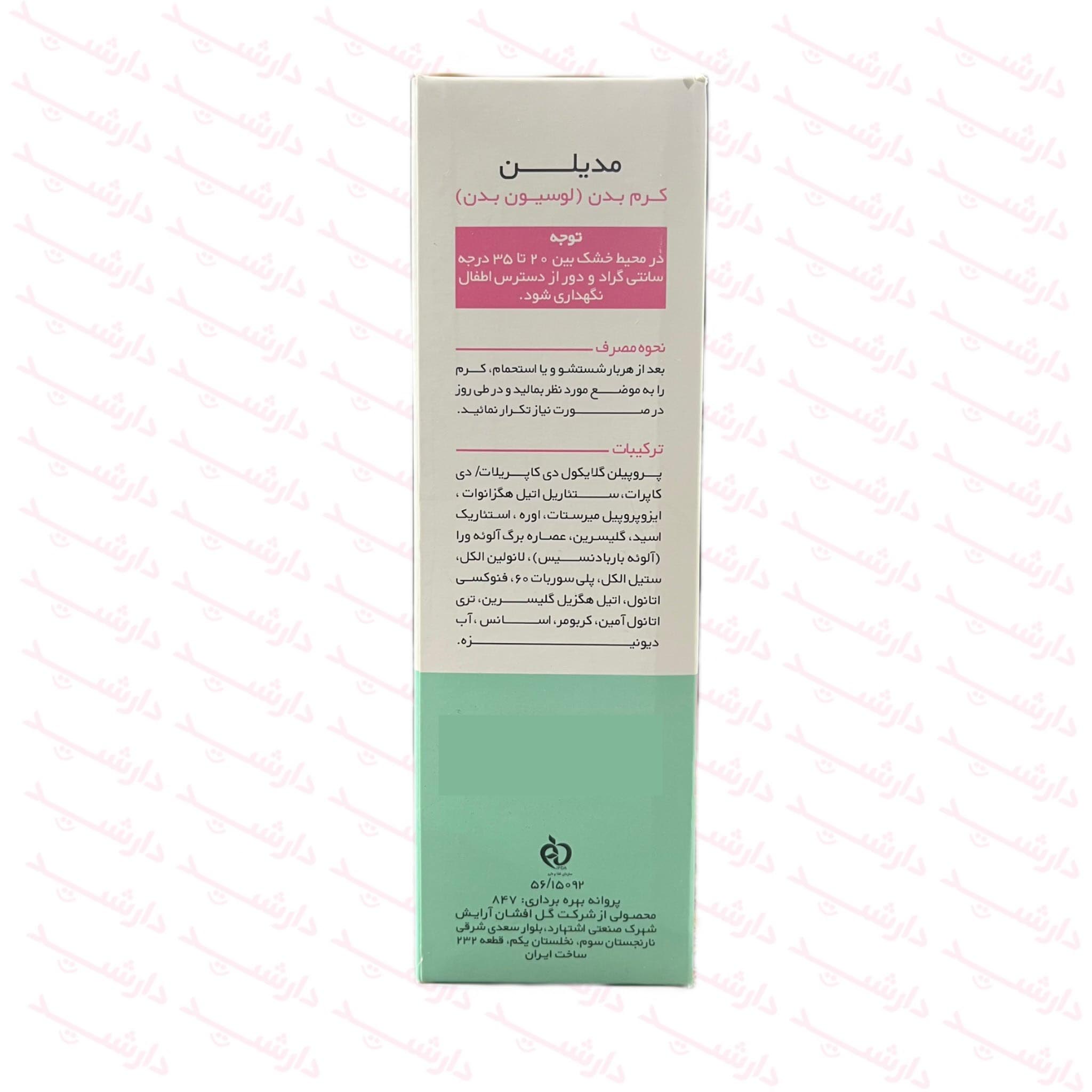 لوسیون بدن مدیلن مناسب انواع پوست زنان و مردان با فرمولاسیون جدید می باشد. این لوسیون بدن حاوی ترکیبات مرطوب کننده ژل آلوئه ورا و گلیسیرین بوده و با تغذیه پوست، خشکی رفع و حس طراوت و شادابی در پوست ایجاد می کند. همچنین یک مرطوب کننده و نرم کننده قوی برای پوست بدن بعد از حمام به شمار می رود. پوست با استفاده روزانه این فراورده با فرمولاسیون جدید مرطوب شده و کلاژنسازی افزایش می یابد. در نتیجه پوست همیشه جوان می ماند.